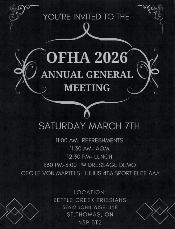 2026 OFHA AGM at Kettle Creek Friesians. Lunch (Subway sandwiches) will be served at 12:30 pm. Tickets are $10 per person. Kindly RSVP by replying to this email prior to the event.